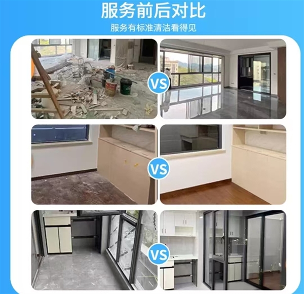 温馨提示:1.提前通水通电;2.按 房产证面积计费;3.不 提供室外擦玻璃;4.除外:建筑垃圾清运、灯具、吊顶等软装家电、贵重物品