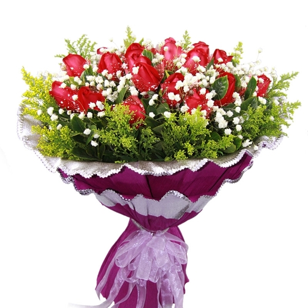 [材料]: 19支昆明A级红玫瑰,黄莺、满天星及绿叶点缀。